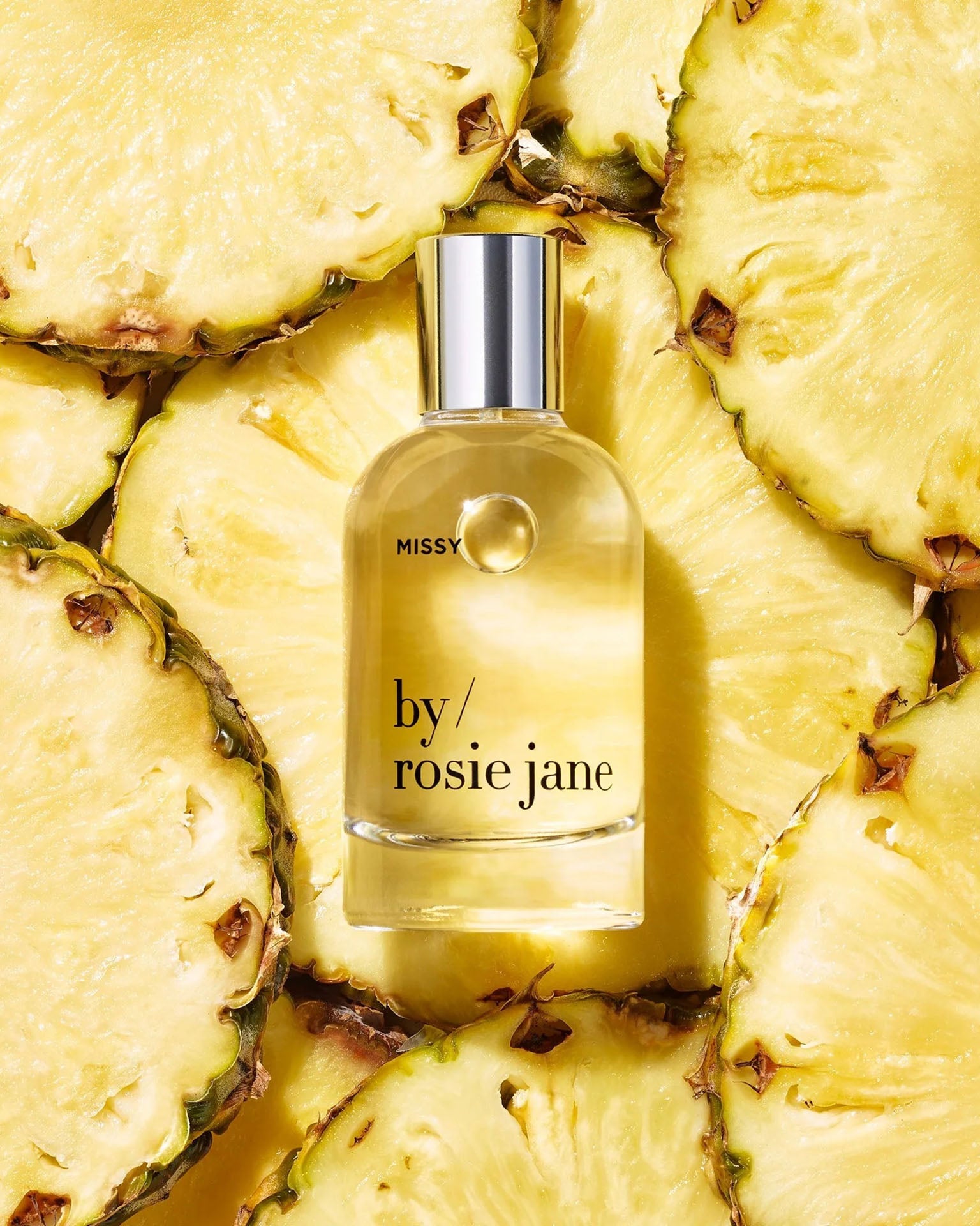 Rosie Jane's Eau De Parfume in Missy is joy in a bottle with notes of toasted coconut, golden pineapple and frangipani petals. Bright tropical fruits, white florals, and fresh citrus create a scent that’s sunshine-ready. Missy is a playful escape from the everyday, inspired by best friends, road trips, and pure happiness.