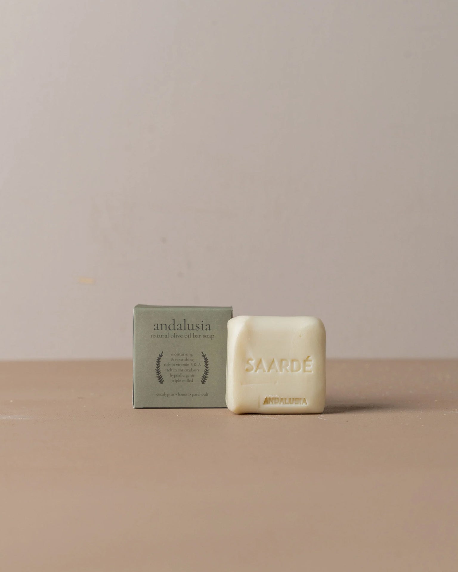 Saardé's natural olive oil bar soap is made on a beautiful sun drenched olive farm on the Aegean coast of Turkey, a region where olives have been grown for over 2000 years. The process and formulation of this soap were specifically developed over many years to be particularly moisturizing and nourishing. Andalusia features aromas of Thyme, Olive leaf, Bergamont and Sandalwood.
