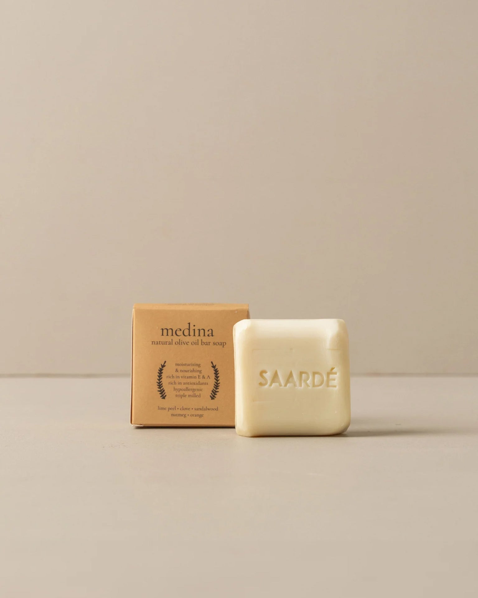 Saardé's natural olive oil bar soap is made on a beautiful sun drenched olive farm on the Aegean coast of Turkey, a region where olives have been grown for over 2000 years. The process and formulation of this soap were specifically developed over many years to be particularly moisturizing and nourishing. Medina features aromas of star jasmine, lemon zest, cinnamon and amber.