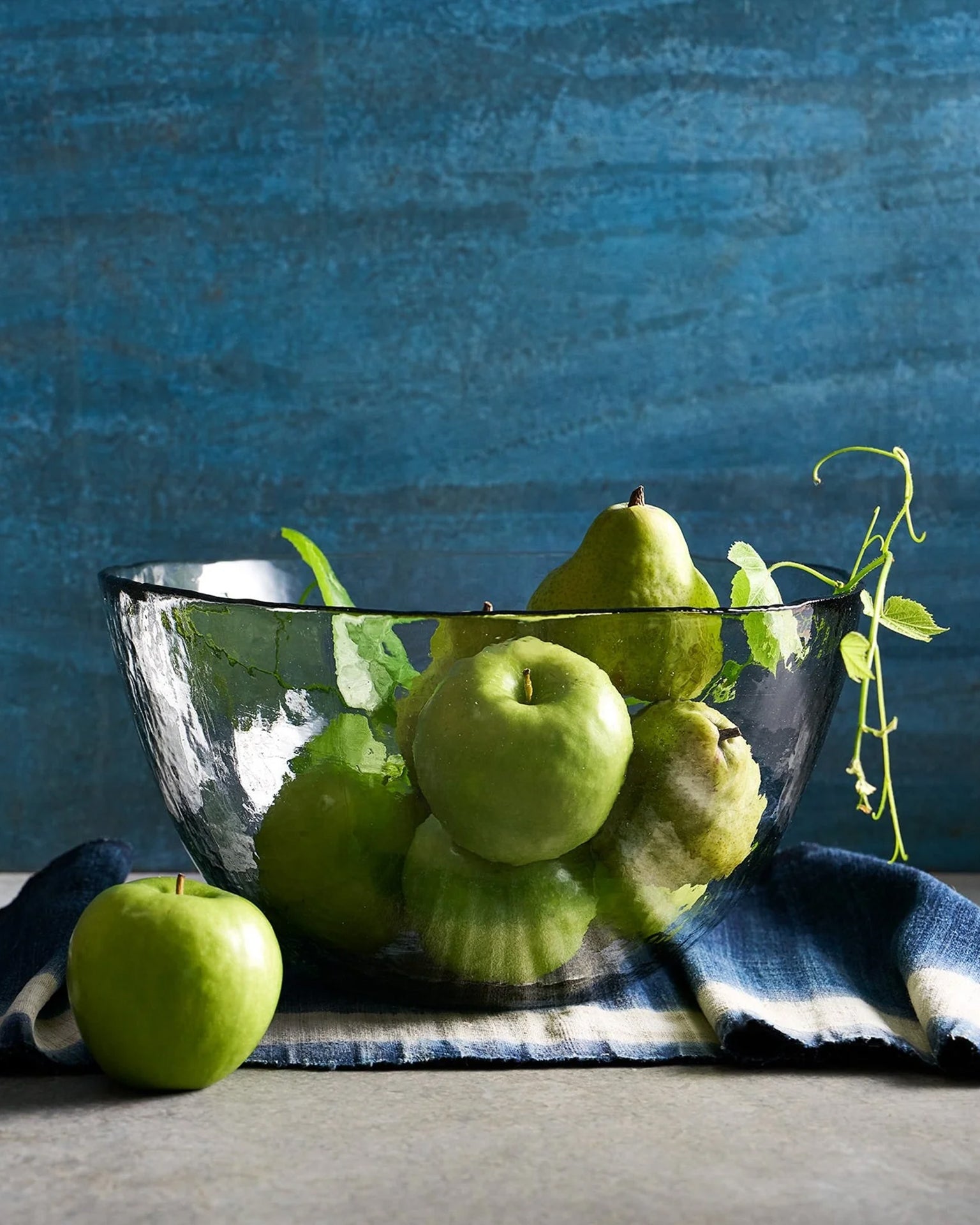 Elevate your table setting with the Pebbled Low Bowl from The Collective. Handcrafted from delicate, hammered glass, this substantial centerpiece adds sophistication to any table. Perfect for displaying fruits or as a standalone piece, its low design brings effortless elegance to every setting.