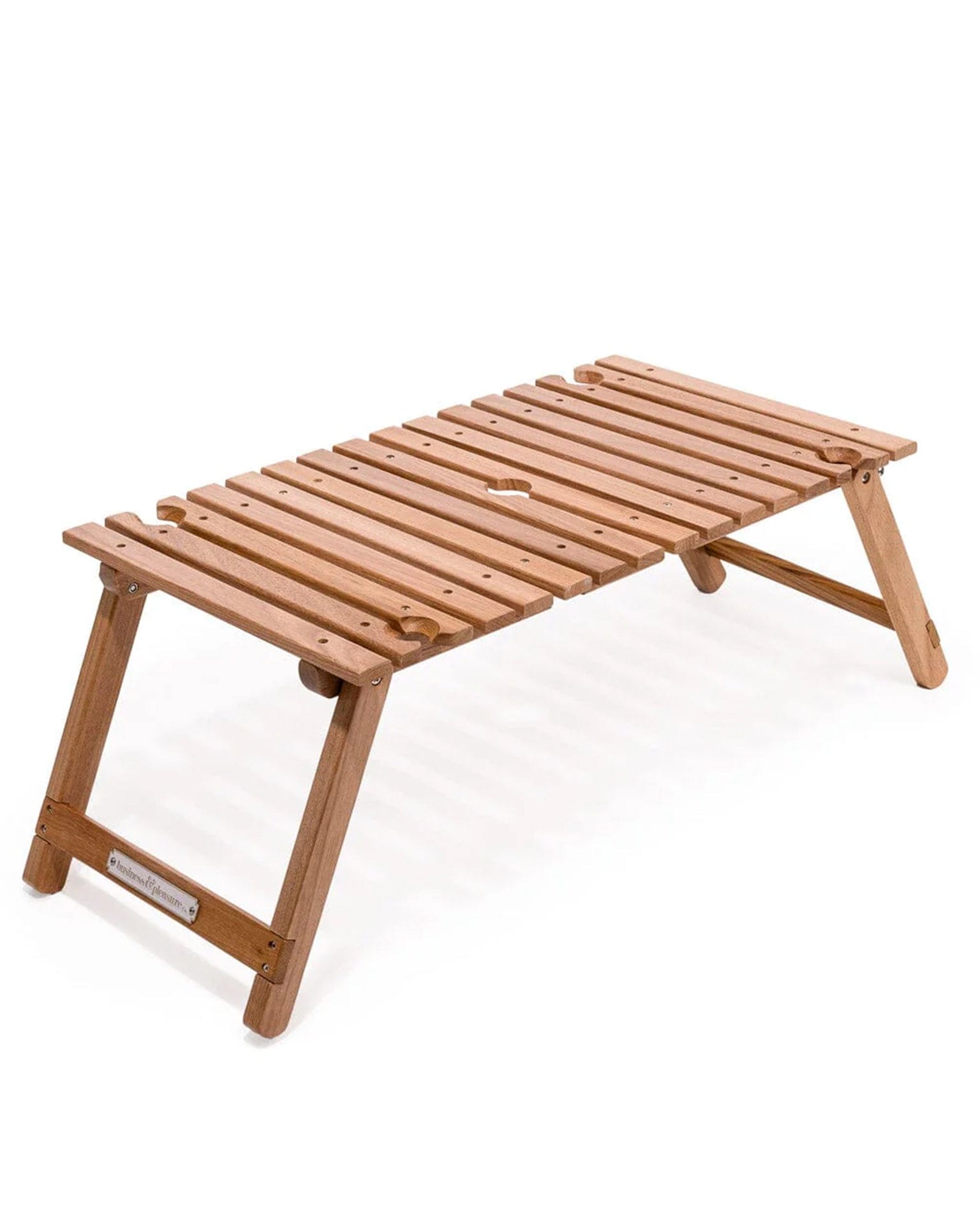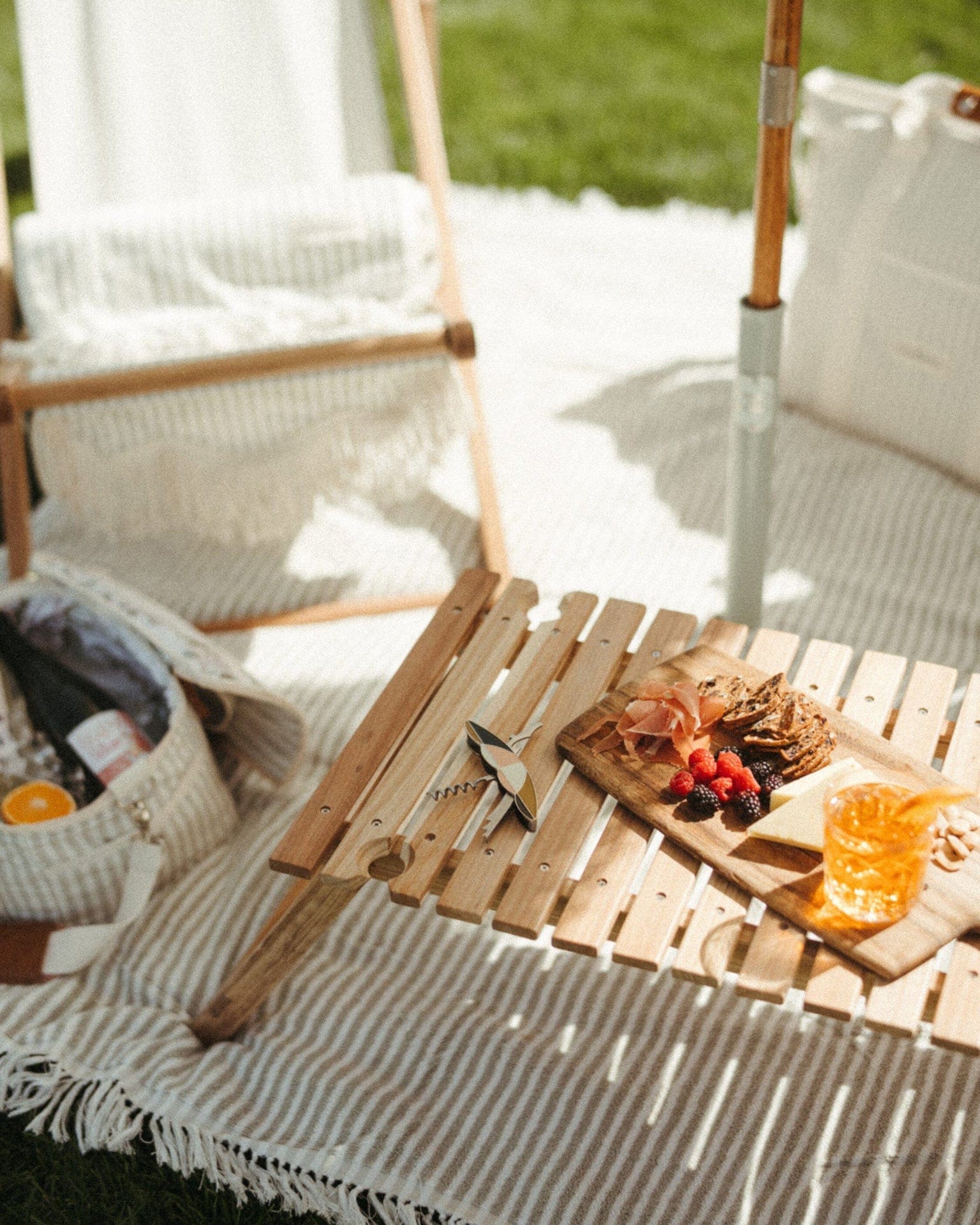 The cutest and most complete compact picnic table around! Business & Pleasure Co made it from teakwood using a weather resistant coating. This adorable little table includes folding legs, a carry strap, 4 wine glass holders and a center Umbrella hole.