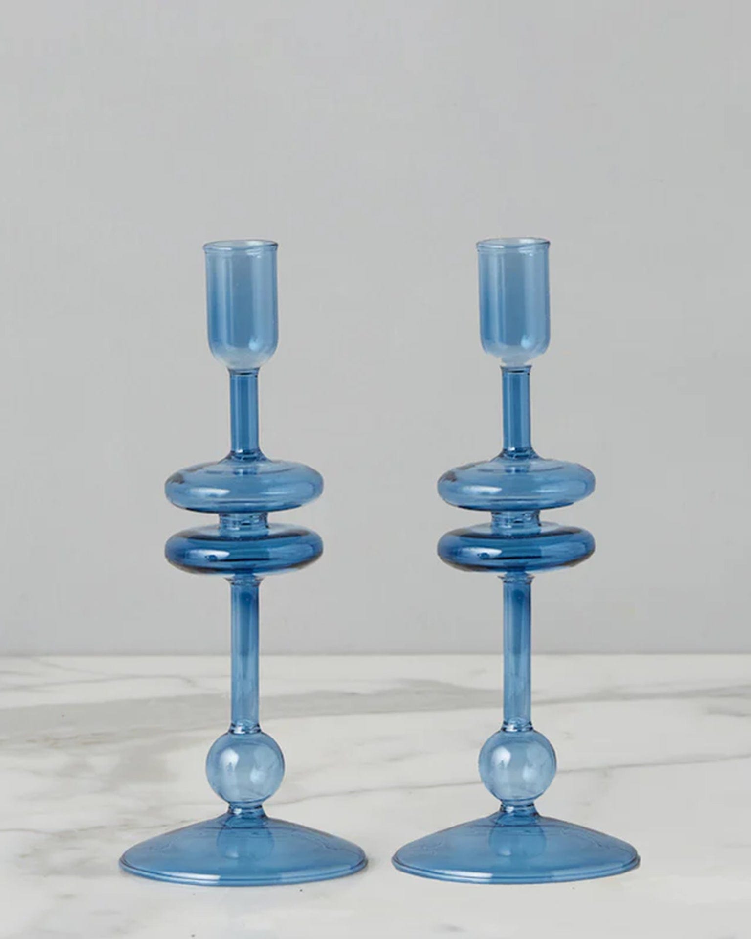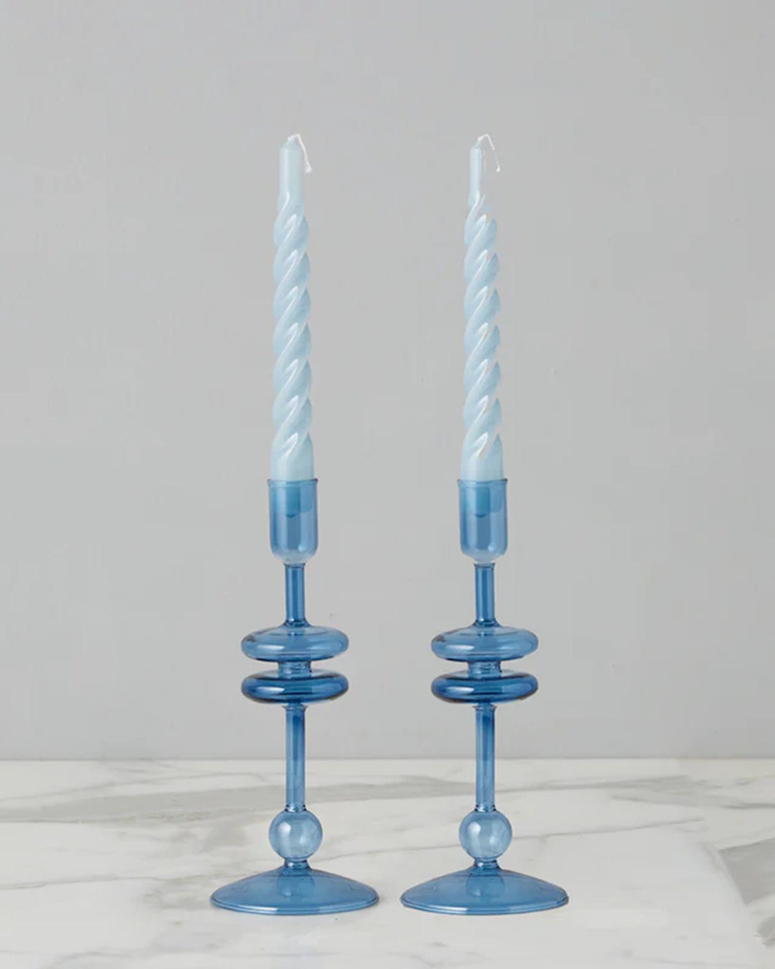 Elevate your home decor with a pair of Sapphire Glass Candlesticks from etúHOME. These expertly crafted taper candle holders add a touch of whim to any room. They are perfect for adding a pop of color to your dinner party or creating a statement throughout your home. Mix and match the sizes and colors to create a memorable tablescape.